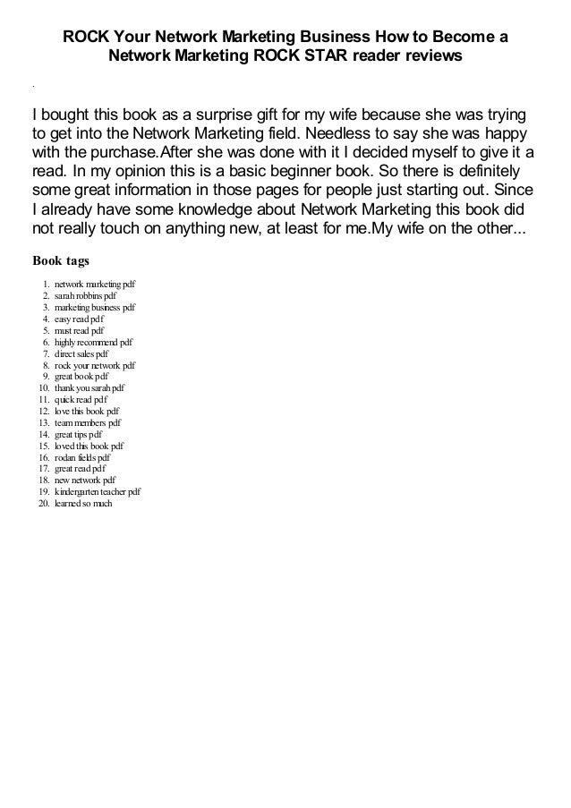 Rock your network marketing business sarah robbins pdf. Sarah wants you to rock your network marketing business and live a life you love through this powerful profession. Sarah Robbins Created Date. Download or read book entitled Rock Your Network Marketing Business written by Sarah Robbins and published by Robbins Skin Care Consulting online.